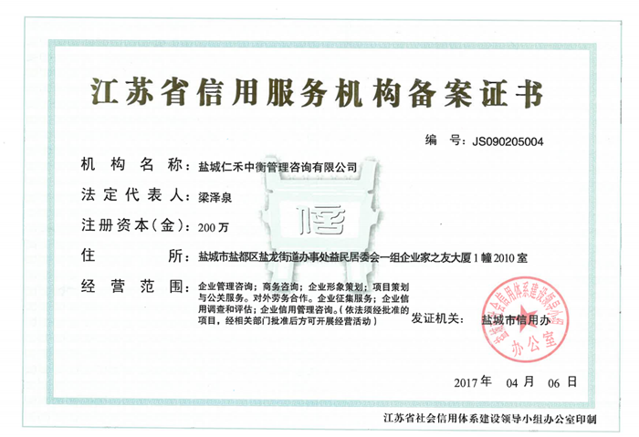 • 江蘇省信用服務(wù)機(jī)構(gòu)備案證書